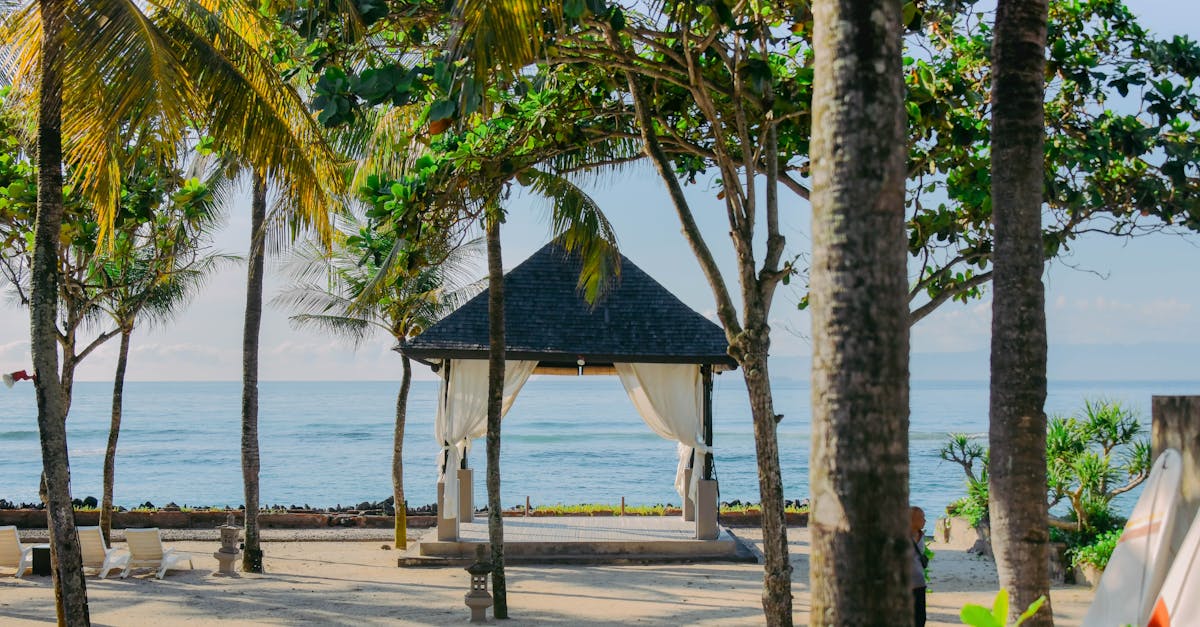! [Tropical beachside pavilion and swaying palm trees offering a peaceful escape during Bali's rainy season! image