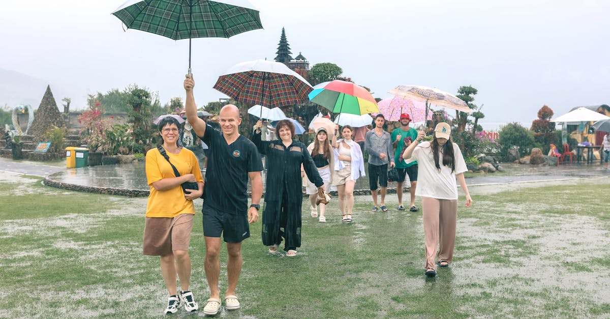 ! [Joyful group carrying colourful umbrellas through a lush tropical garden on a rainy day in Bali! image