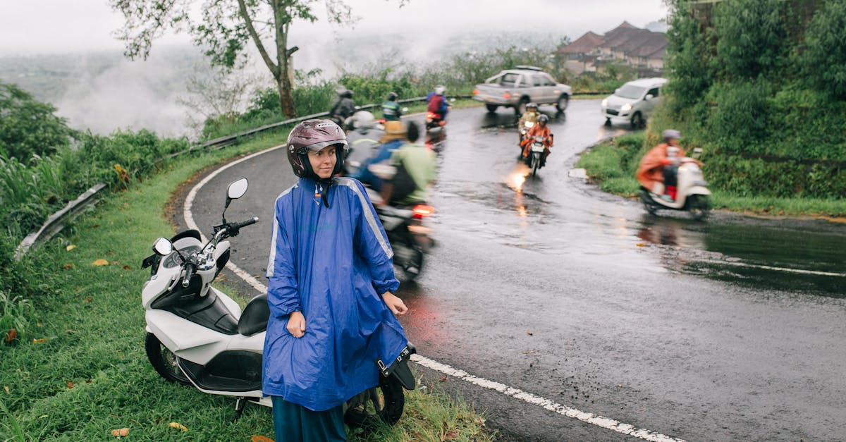 ! [Traveller in a raincoat riding past motorbikes on a mountain road during Bali rainy season! image