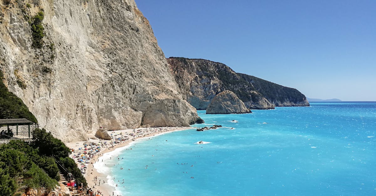 ! [Adembenemend uitzicht op het turkooizen water en de kliffen van Egremni Beach tijdens de Griekse zomer.! image