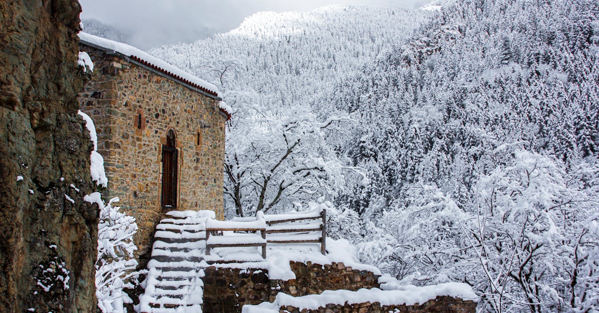 ! [Besneeuwd Grieks berglandschap met stenen gebouw omringd door bomen in de wintermaanden.! image