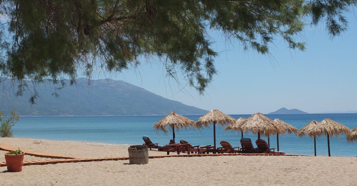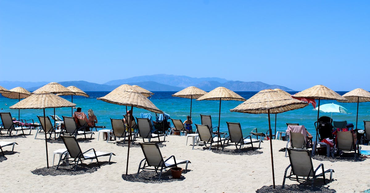 ! [Ontspannen strandstoelen en parasols aan een zonnig Grieks strand, kenmerkend voor het warme griekenland weer.! image