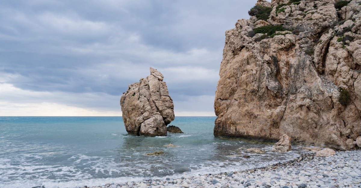 ! [Skały Afrodyty w Pafos na Cyprze – dramatyczny widok wybrzeża Morza Śródziemnego pod zachmurzonym niebem.! image